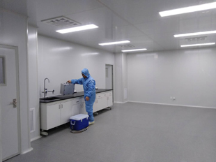 工程项目:200多平米的净化厂房整体装修。净化厂房的地面,先用水泥自流坪做地面找平,在用地胶整铺,接缝用专业地胶焊接线焊接。墙体和顶面用净化板建设,墙体拐弯用铝合金圆柱做墙体的衔接。墙角和顶角用铝合金弧型胡角衔接,起防尘作用。门和墙体都合理安装玻璃观察窗。